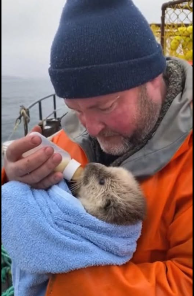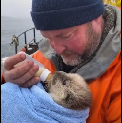 He warmed the milk with water from his kettle and sat down, cradling the otter like a newborn. Finn, moved by the sight of the rough fisherman so gentle, quietly took out his phone. “Easy now, little one,” Alistair whispered, his rough voice softening as the tiny creature finally latched on. “Gotcha. You’re safe now.”