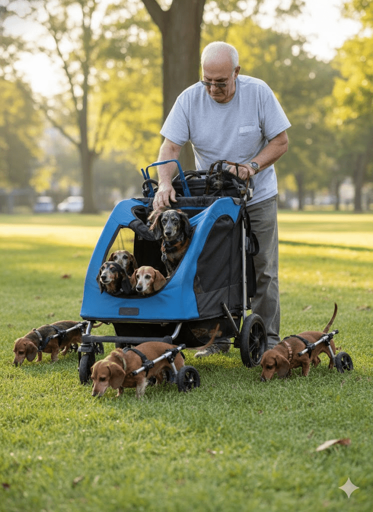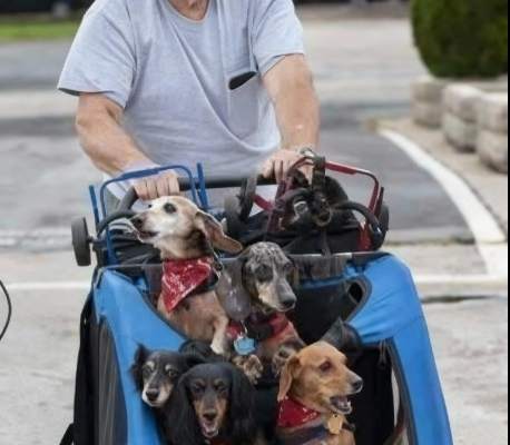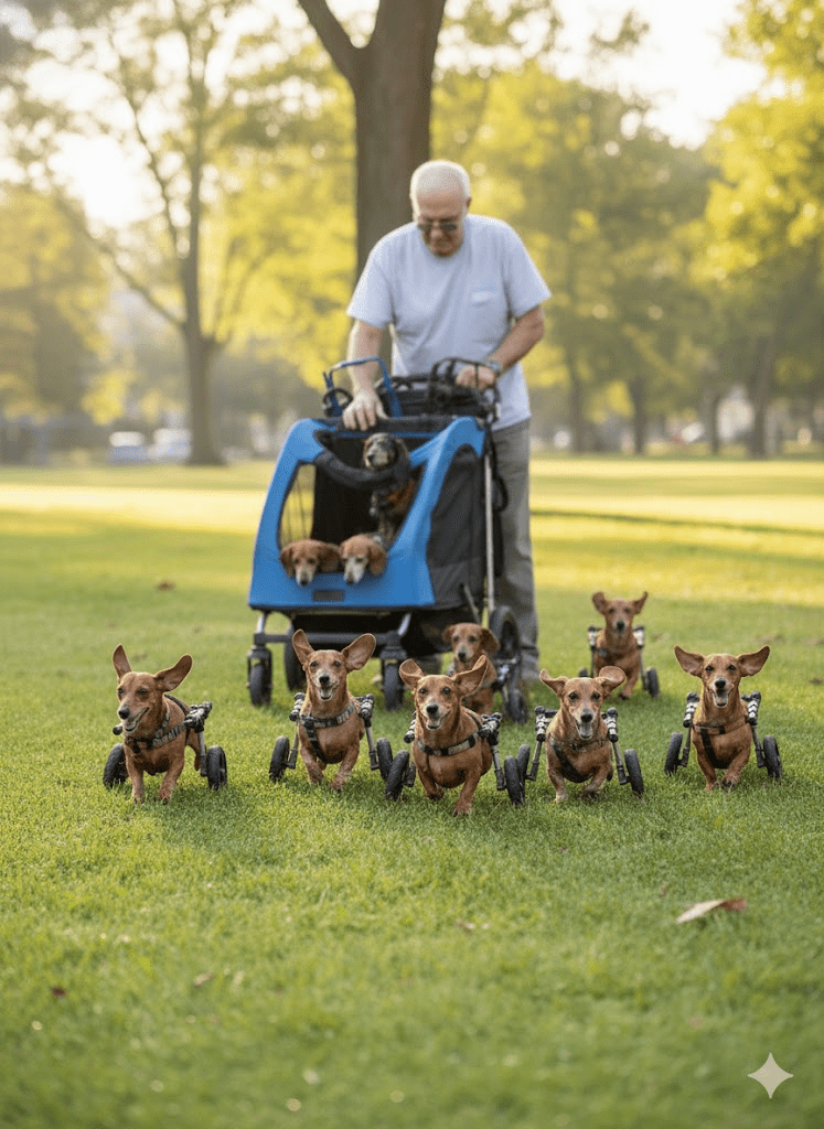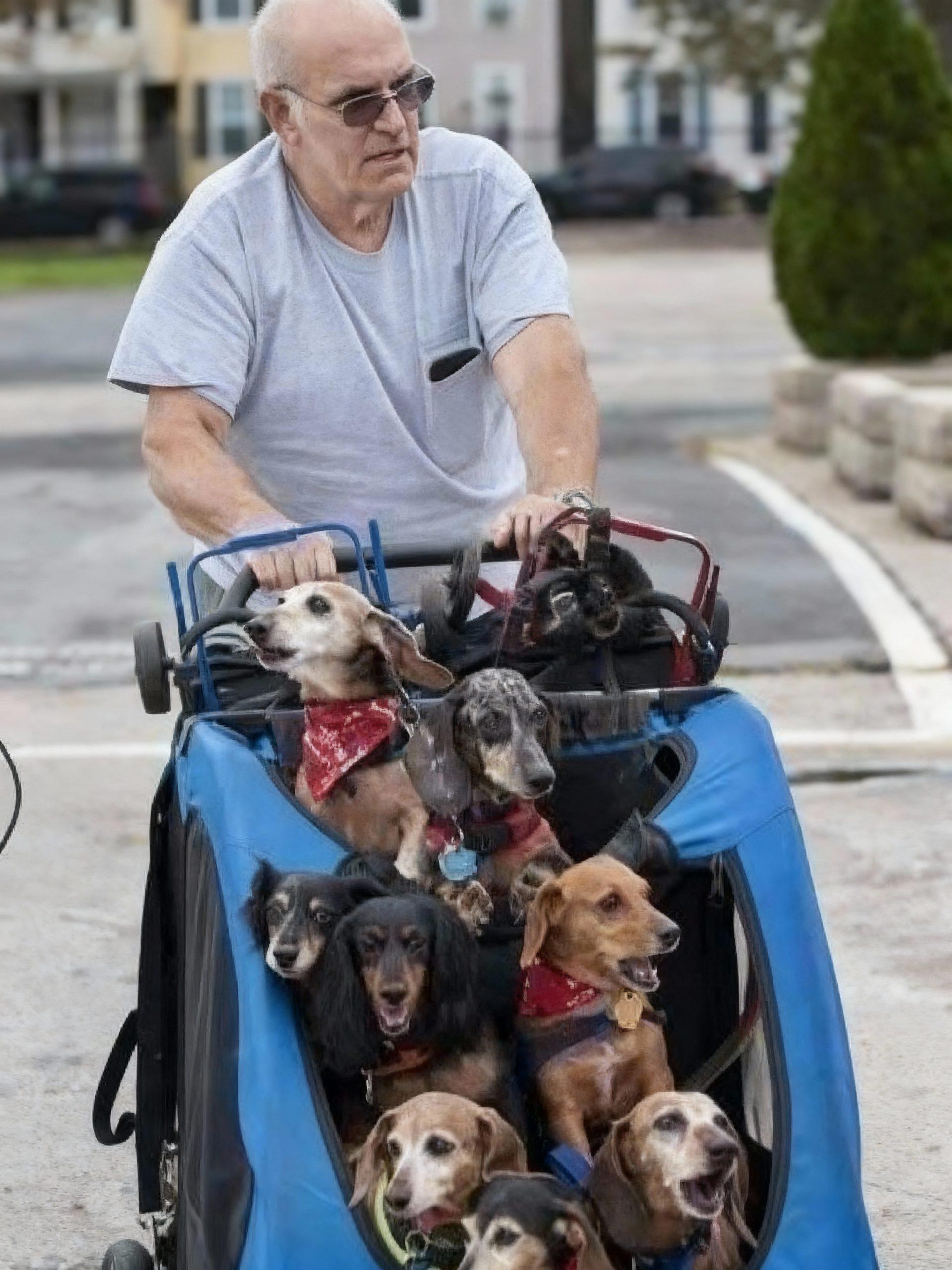 In a quiet suburban neighborhood, amidst the predictable rhythms of daily life, an extraordinary sight unfolds each morning. As the first rays of dawn pierce through the tree canopy, a lone figure emerges, not with a morning paper or a brisk jog, but pushing a custom-built stroller teeming with wagging tails and bright, expectant eyes. This isn’t a typical dog-walker, nor are these typical dogs. This is Gregory Lane, affectionately known as “the dog dad with the wheels,” and his cherished companions are a troupe of paralyzed canines, each a survivor, each given a second chance by a man who saw not their limitations, but their boundless capacity for joy. His journey into this unique form of rescue began years ago with a single, heartbreaking encounter that would irrevocably alter the course of his life and touch the lives of dozens of animals deemed “unfixable” by others.