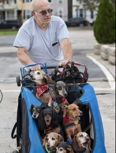 In a quiet suburban neighborhood, amidst the predictable rhythms of daily life, an extraordinary sight unfolds each morning. As the first rays of dawn pierce through the tree canopy, a lone figure emerges, not with a morning paper or a brisk jog, but pushing a custom-built stroller teeming with wagging tails and bright, expectant eyes. This isn’t a typical dog-walker, nor are these typical dogs. This is Gregory Lane, affectionately known as “the dog dad with the wheels,” and his cherished companions are a troupe of paralyzed canines, each a survivor, each given a second chance by a man who saw not their limitations, but their boundless capacity for joy. His journey into this unique form of rescue began years ago with a single, heartbreaking encounter that would irrevocably alter the course of his life and touch the lives of dozens of animals deemed “unfixable” by others.