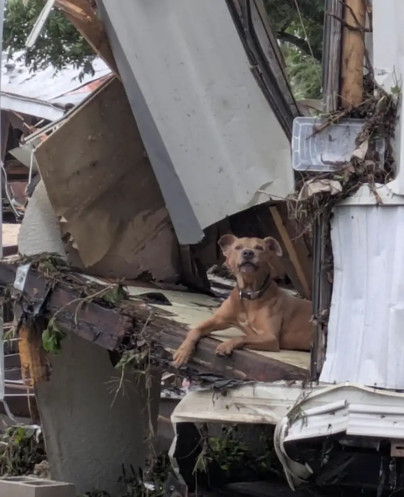 When the floods swept through Central Texas, they left behind destruction that words can barely describe. Homes were washed away, lives were lost, and the landscape itself seemed scarred by grief. Amid the chaos, one small survivor waited — a black-and-brown dog perched on a heap of twisted debris, his eyes full of confusion and sorrow.