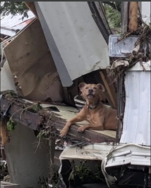 When the floods swept through Central Texas, they left behind destruction that words can barely describe. Homes were washed away, lives were lost, and the landscape itself seemed scarred by grief. Amid the chaos, one small survivor waited — a black-and-brown dog perched on a heap of twisted debris, his eyes full of confusion and sorrow.